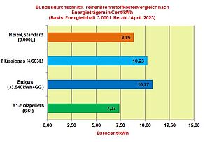 Auf Basis monatlicher repräsentativer reiner Brennstoffkostenermittlungen durch das Brennstoffverkaufsportal www.brennstoffhandel.de (Verkauf von Heizöl, Holzpellets und Flüssiggas) für die wichtigsten Brennstoffe/Energieträger im Wärmemarkt kann für den Monat April 2023 folgende aktuelle Bewertung, bezogen auf eine Abnahmemenge von 3.000 Litern Heizöl (entspricht einem Energiegehalt/Wärmeinhalt von 30.240 kWh - bei Erdgas entspricht dies einem Energiegehalt von 33.540 kWh), vorgenommen werden: