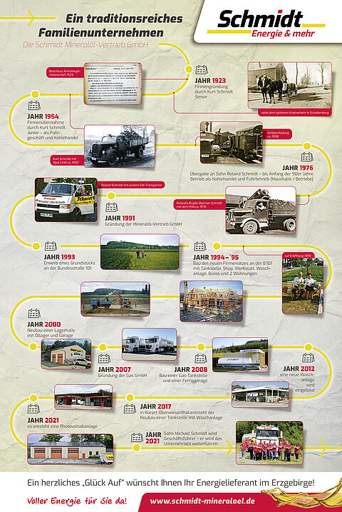 Die eigenständige Schmidt Mineralöl-Vertrieb GmbH blickt auf eine lange Tradition zurück. Der Gründer des Familienunternehmens Kurt Schmidt sr. gründete seinen Brennstoffhandel bereits im Jahre 1923. Sein Sohn Kurt Schmidt jr. übernahm das Unternehmen 1945 als Fuhrgeschäft und Kohlehandel, welches 1976 wieder an dessen Sohn Roland Schmidt übergeben wurde.